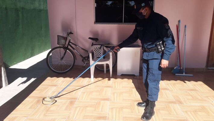 Uma cobra jararaca foi encontrada, por um morador na varanda de uma casa na manhã desta quarta-feira (22), na área central de Coxim. O homem, 48 anos, acionou a Polícia Militar Ambiental (PMA) para fazer o resgate.